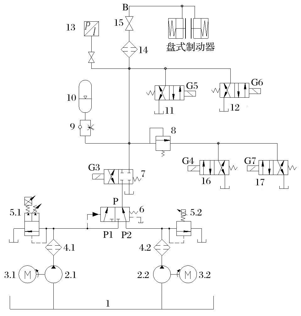 (1) 雙泵液壓站 該方案中,1 套制動(dòng)系統(tǒng)配置1 臺(tái)液壓站。液壓站上設(shè)計(jì) 2 套泵裝置+1 套液壓閥組,2 套泵裝置互為備用,1 套液壓閥組共用。當(dāng)工作泵出現(xiàn)故障時(shí),通過電控程序可實(shí)現(xiàn)備用泵的自動(dòng)切換。