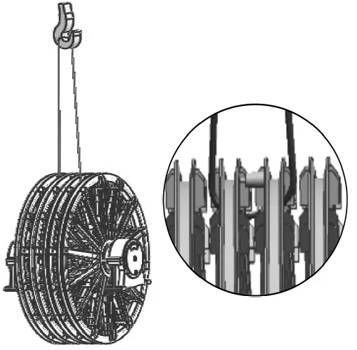 4m以下規格天輪裝置:采用兩根等長鋼絲繩。鋼繩兜吊中間兩個輪子的輪緣,兩根鋼絲繩分別掛在同一處槽鋼的左、右兩側。為防止輪子變形,兩吊掛輪子之間需用千斤頂支墊。