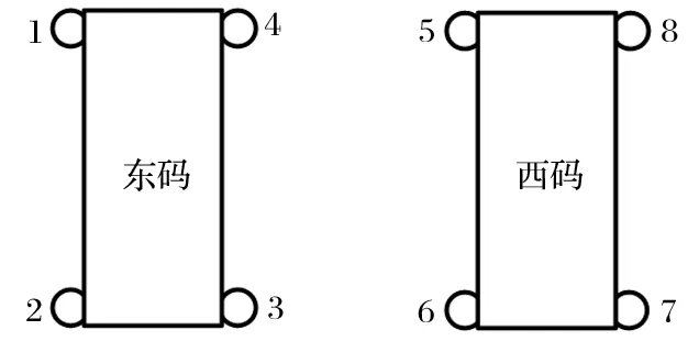 東西兩碼罐籠各有 4 根、共 8 根鋼絲繩罐道,罐道繩的分布如圖5 所示,圖中 1~8 號為罐道繩,下同。測試結(jié)果如表2 所列。