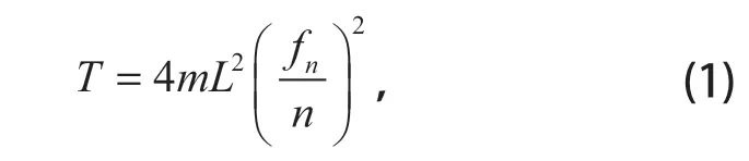 式中:m 為鋼絲繩單位長度質量,kg/m;L 為鋼絲繩長度,m;n 為自振頻率的階數;fn 為鋼絲繩第 n 階自振頻率,Hz。