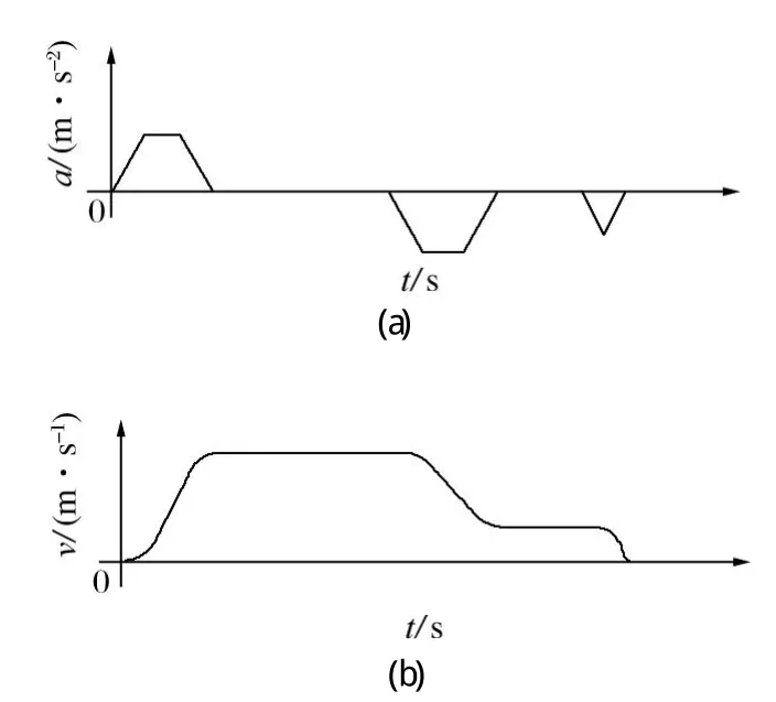 (4)重視提升系統沖擊限制,常用的有矩形加/減速度控制和梯形加/減速度控制,分別如圖1、2所示。采用梯形加/減速度控制曲線,并且加/減速度的變化率不宜大于 0.3 m/s3,以減少加/減速過程中提升鋼絲繩所受的動張力及彈性振動。新建礦井尤其是深井提升系統宜采用恒減速制動,可有效控制緊急制動過程中提升鋼絲繩的動張力,同時避免提升鋼絲繩打滑現象。