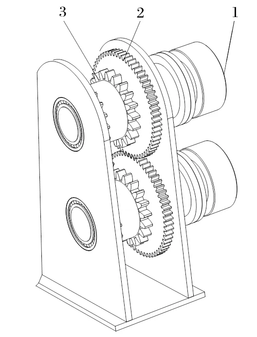 在現(xiàn)有研究的基礎(chǔ)上,本研究提出在連接兩鏈輪的軸上加一對同步齒輪。這樣不僅可以實現(xiàn)連續(xù)送繩,而且當(dāng)兩液壓馬達輸出的轉(zhuǎn)速不同步時,可通過同步齒輪強制將兩軸轉(zhuǎn)速相同,從而實現(xiàn)兩鏈輪轉(zhuǎn)速同步,避免鋼絲繩打滑等問題。但這樣會導(dǎo)致同步齒輪受到較大的沖擊,如受到來自同步齒輪的相互擠壓,或液壓馬達輸出轉(zhuǎn)矩不穩(wěn)定時對齒輪的影響等,因此需要對同步齒輪進行進一步的分析。