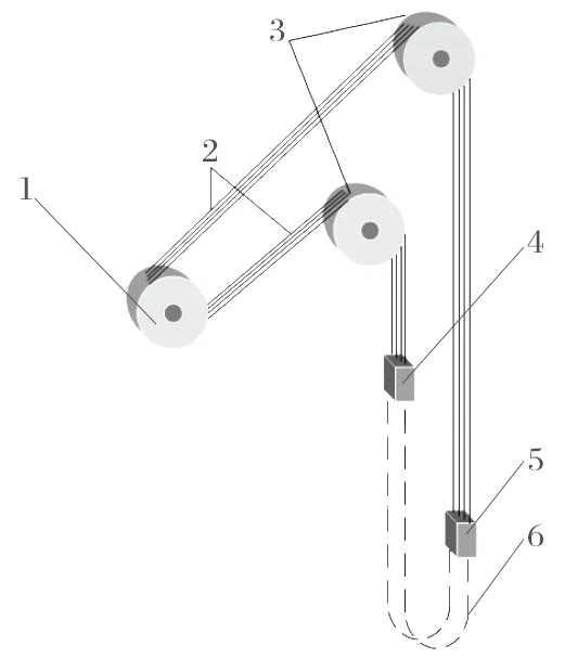 礦井多繩摩擦式提升機是我國礦井領域zui常用的提升裝備,主要用于提升人員、設備和物料。該提升系統主要由驅動裝置、多根鋼絲繩、上下天輪及罐籠等部分組成,其結構如圖1 所示。其中,驅動裝置由電動機、減速機和聯軸器等部分組成,可將電能轉變為機械能,實現對罐籠的提升和下放;上下天輪用于對鋼絲繩進行改向。提升鋼絲繩在天輪位置會出現彎曲變形,鋼絲繩的應力會出現突變。