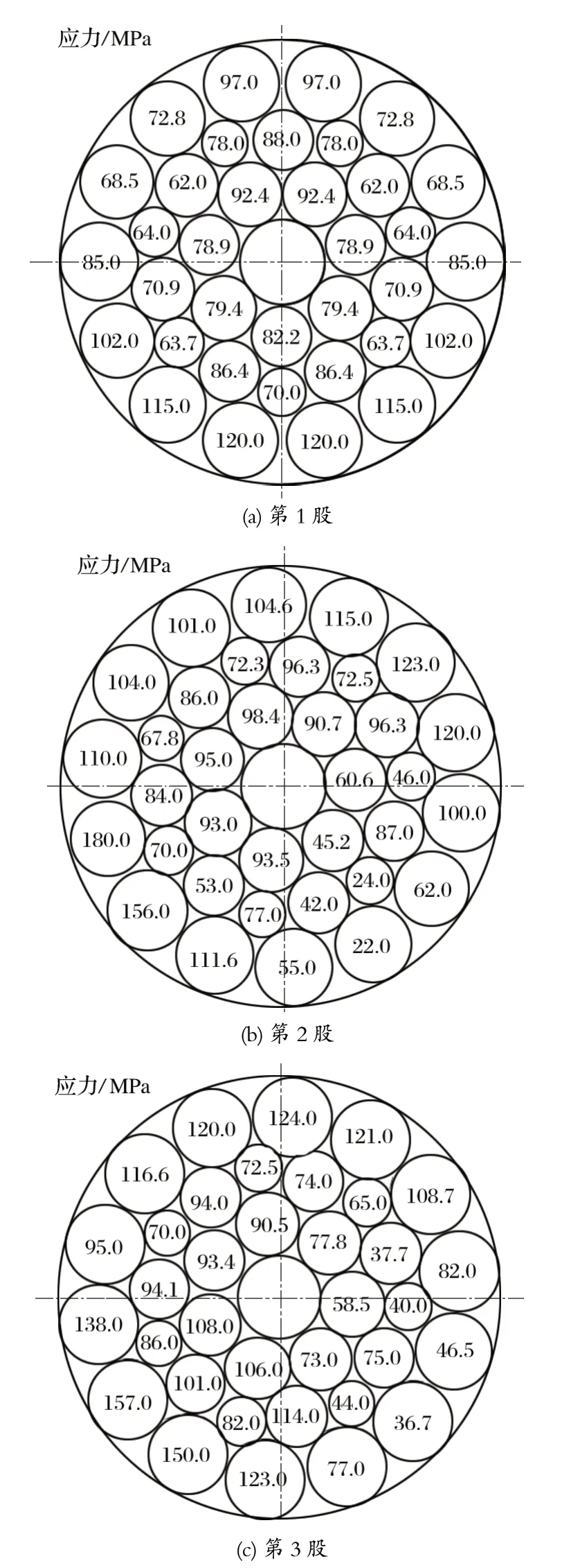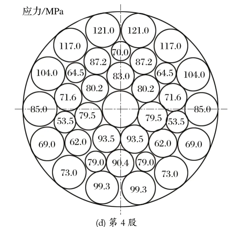 將鋼絲繩纏繞在直徑為 2 m 的天輪上,在實(shí)際求解時(shí),將計(jì)算內(nèi)部接觸點(diǎn)位置作為求解的計(jì)算點(diǎn)。此時(shí),選取位于摩擦天輪繩槽上下兩側(cè)和右側(cè)的部分繩股作為研究對(duì)象,并且沿著順時(shí)針?lè)较蜻M(jìn)行標(biāo)記,標(biāo)記出第 1、2、3、4 股。仿真分析得到的鋼絲繩應(yīng)力分布如圖4 所示。